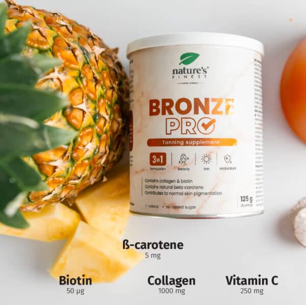 In addition to collagen, Bronze PRO also contains beta-carotene, a natural pigment. Beta-carotene is also naturally present in fruits and vegetables, such as carrots, peppers and mangoes.
