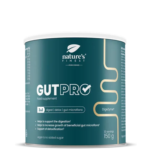 GutPRO is a food supplement that combines a complex of digestive enzymes, plant extracts, and prebiotic fibers in a single formula.