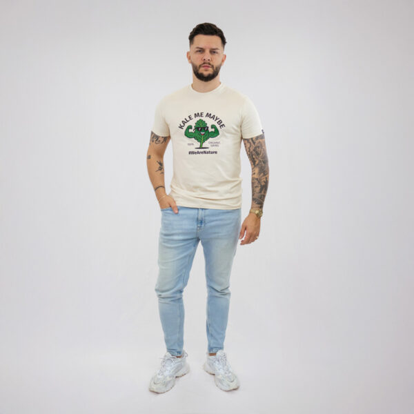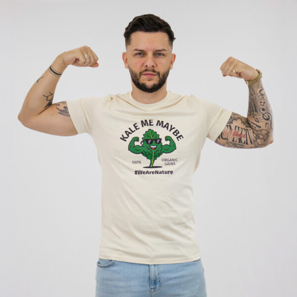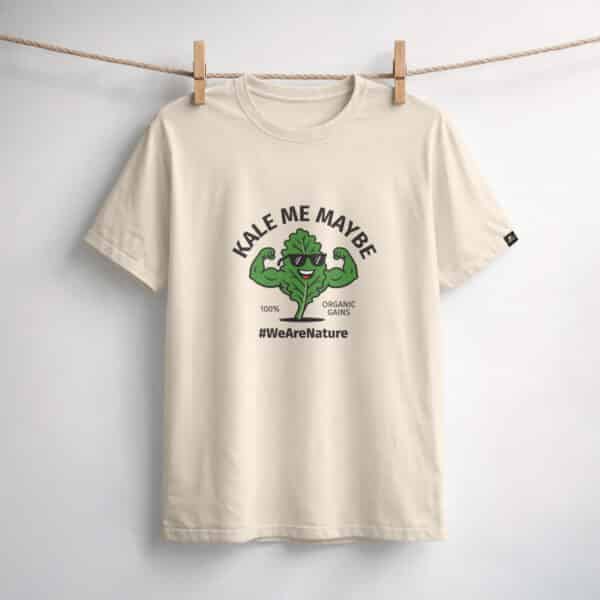 A minimalist beige T-shirt that combines effortless style with a relaxed feel. Featuring the playful phrase “Kale Me Maybe” and a fun graphic, it adds a laid-back, confident touch to any outfit.