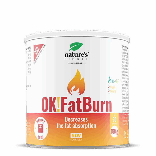 OK!Fatburn is an effective weight loss formula that inhibits enzymes for carbohydrate and fat digestion with the help of ID-alG™. The triple effect of the formula contributes to normal metabolism that produces energy⁴, with the added power of L-tyrosine and L-carnitine. Studies confirm noticeable weight loss associated with a reduction in fat mass.¹