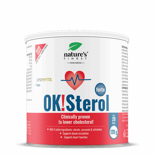 OK!Sterol Forte contains patented Lipophytol® with plant sterols that contribute to the maintenance of normal blood cholesterol levels¹. Artichoke also helps decrease the level of lipids in blood³, while turmeric supports heart health².