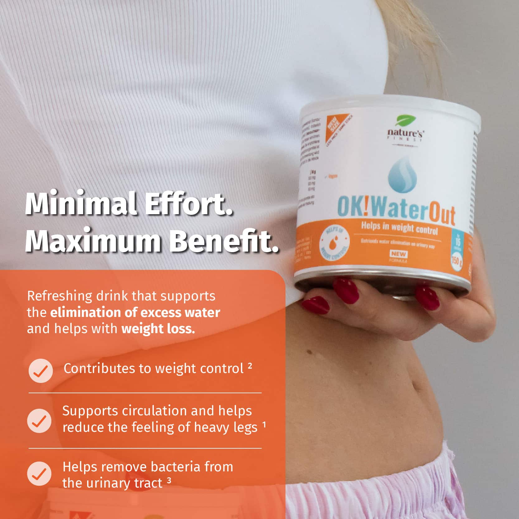 Every day, dose 2 scoops (10 g) of OK!WaterOut into a glass of water. With one scoop you will consume 50mg of knotweed, 100 mg of nettle extract and 100 mg of elderberry extract.