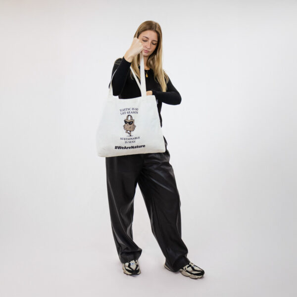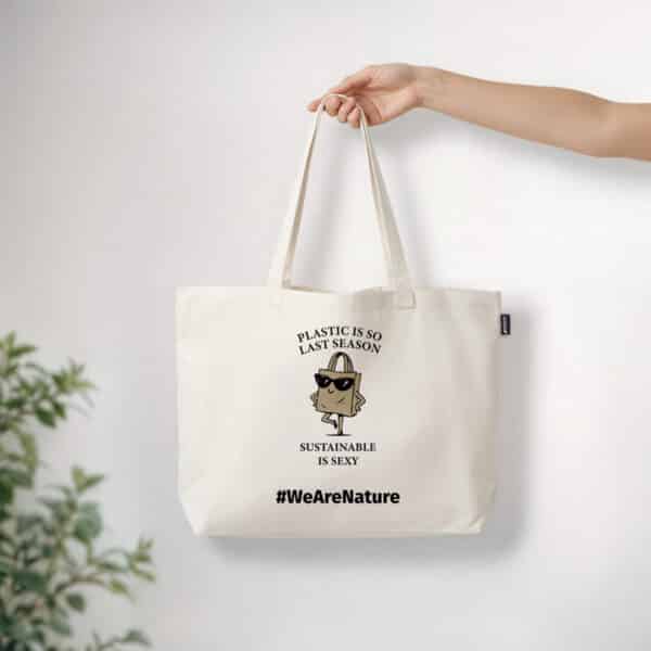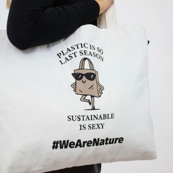 A timeless tote designed for everyday style with a sustainable edge. Printed with the playful message “Plastic is so last season. Sustainable is sexy.” and a charming illustration of a confident shopping bag in sunglasses, it brings humour and attitude to conscious living.