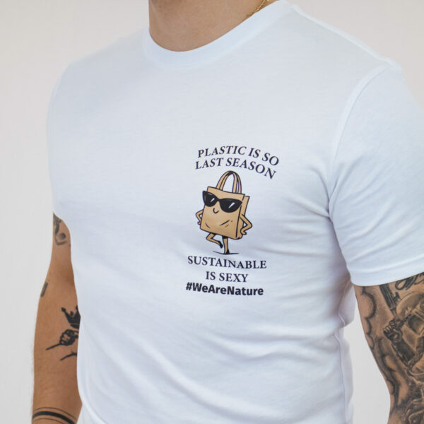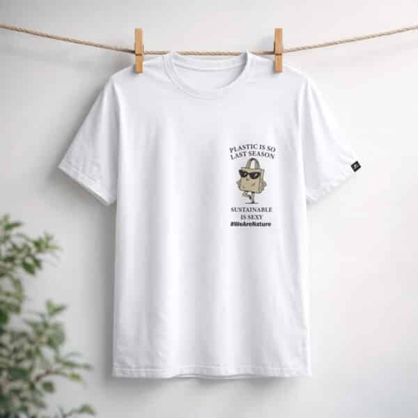 A minimalist white T-shirt that blends style with purpose. Featuring the bold statement “Plastic is so last season. Sustainable is sexy.” in an eye-catching graphic, it adds a confident, playful edge to any outfit.